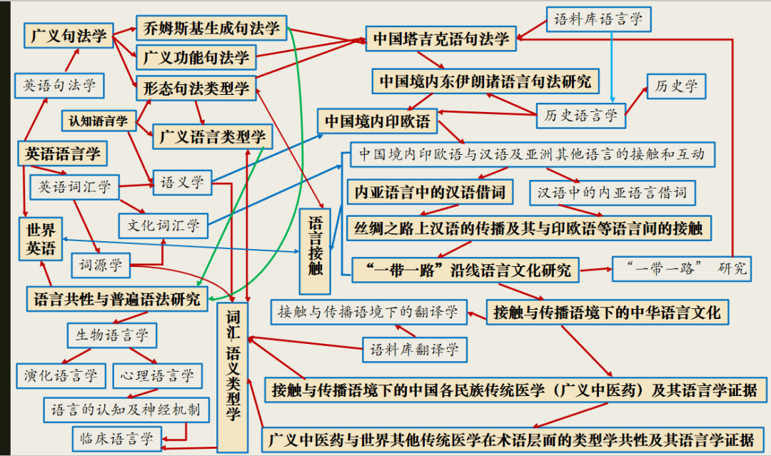 除了承担繁重的语言学、翻译及论文写作等教学任务之外,曾俊敏对科学研究也一直情有独钟。他对科研的兴趣就如同他对语言的兴趣,涉猎广泛,颇有“杂家”之感。身在中医药大学,曾俊敏对中医药文化在小语种国家的外译与传播倾注了诸多心力,不仅积极从事中医英译实践与研究,新近还立项了一项《黄帝内经》意大利语译本的省级课题,但他不忘初心,始终坚持在“冷门绝学”塔吉克语领域精深钻研。如何在不同的语言之间转换,平衡好不同的教学、科研任务之间的差异,曾俊敏的秘诀就是找到关键的“连接点”——正如他多次在讲座中展示过的这张他个人的“科研路线图”,错综复杂的连接线生动反映了他如何努力寻找“连接点”以打通各个看似相互独立的科研领域,最终融为一炉: