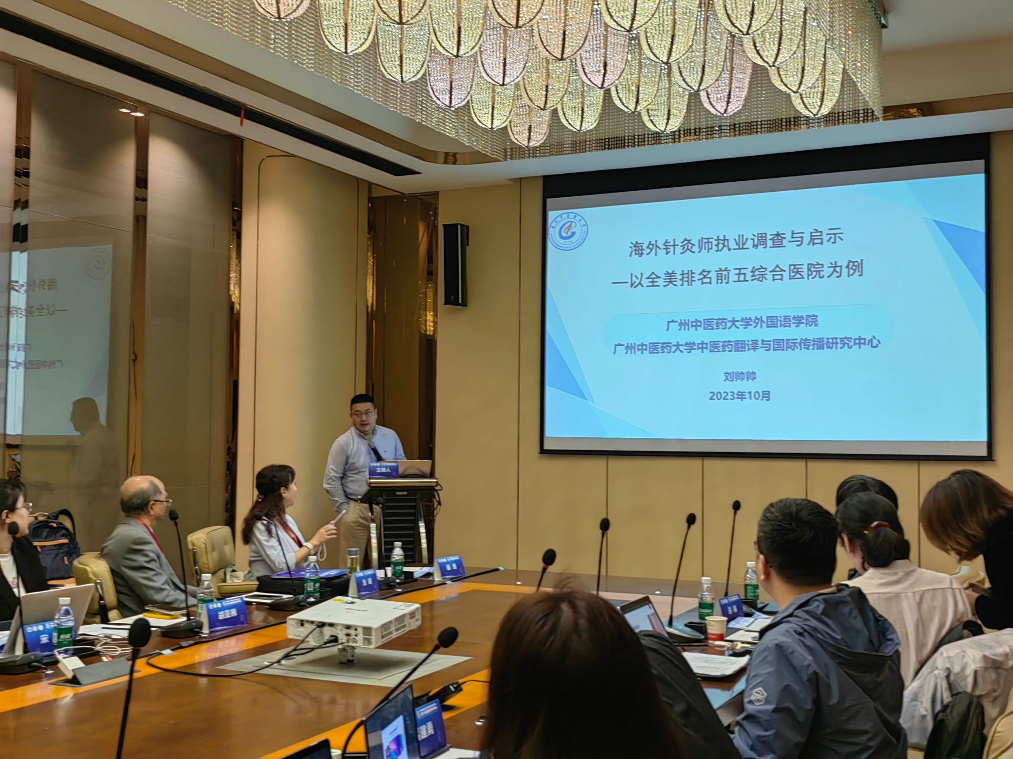 苏红院长主持了28日上午的世界中医药学会联合会翻译专业委员会会长单宝枝教授的主旨发言“理解与表达——中医术语英译常见错误案例讲评”和美国神经针灸研究院院长郝吉顺教授的主旨发言“头针的翻译技巧、临床应用和展望”,参加了28日下午的“外国语学院/国际教育学院(交流合作处)院(处)长中医翻译与人才培养高峰论坛”。我院研究生英语教研室刘帅帅主任做了题为“美国针灸师执业调查与启示”的平行论坛发言。研究通过采集2020-2021年度美国排名前五综合医院针灸师执业数据,重点调查和分析了针灸师执业身份、教育背景、执业部门及擅长病种。研究发现,美国本土培养针灸师已成为综合医院针灸师主体,针灸治疗仍主要用于镇痛,且治疗范围不断扩大;但针灸师疏于考取执照,建议进一步推动在美针灸立法,提高执业门槛,增加设立在美针灸院校,方便执照申请。