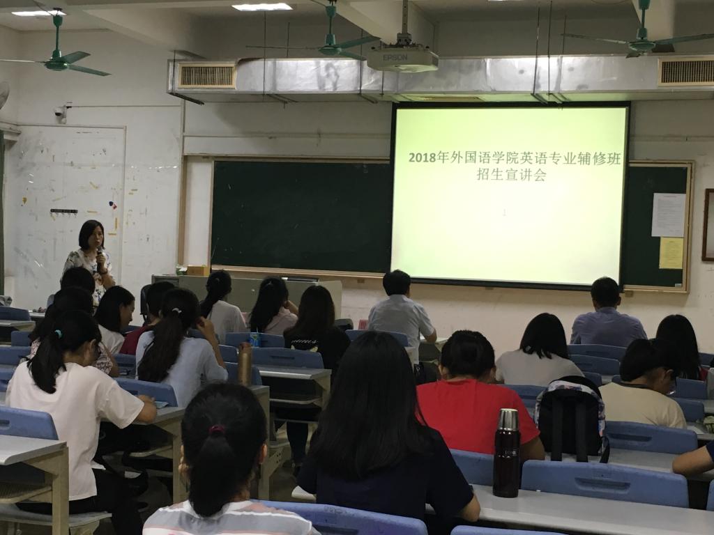 为了进一步调动我校学生学习的积极性,提高就业竞争力,在学校领导重视和支持下,我院英语专业辅修班招生宣讲会于6月11日晚上7:00在A201举行。学校教务处曾元儿处长,我院苏红院长,经管学院心理系马主任、我院党政办老师以及参加宣讲会的近50名同学参加了本次宣讲会。