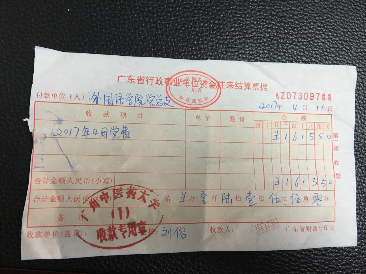 外国语学院党总支2017年4月上交党费收据