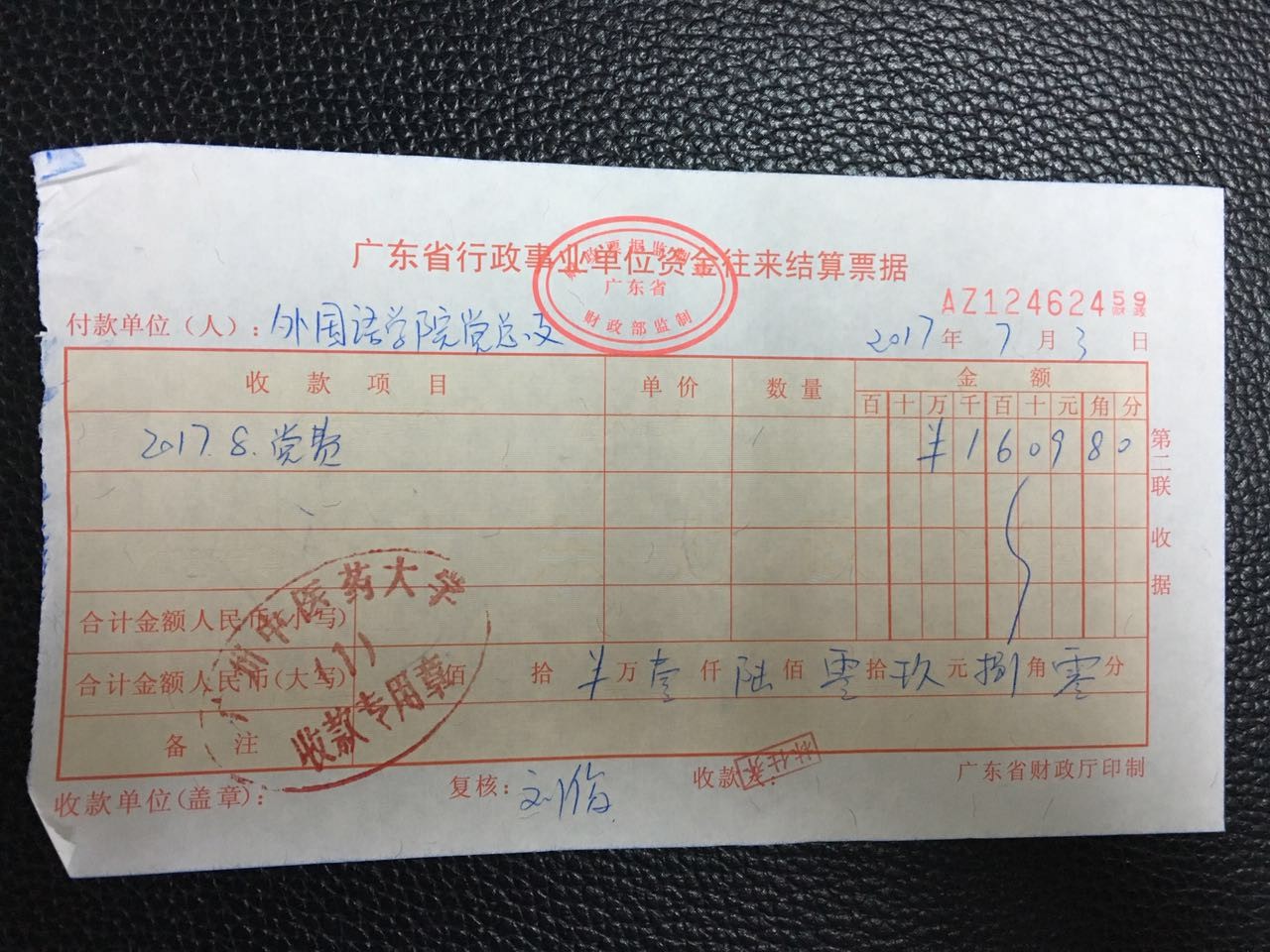 外国语学院党总支2017年8月上交党费收据