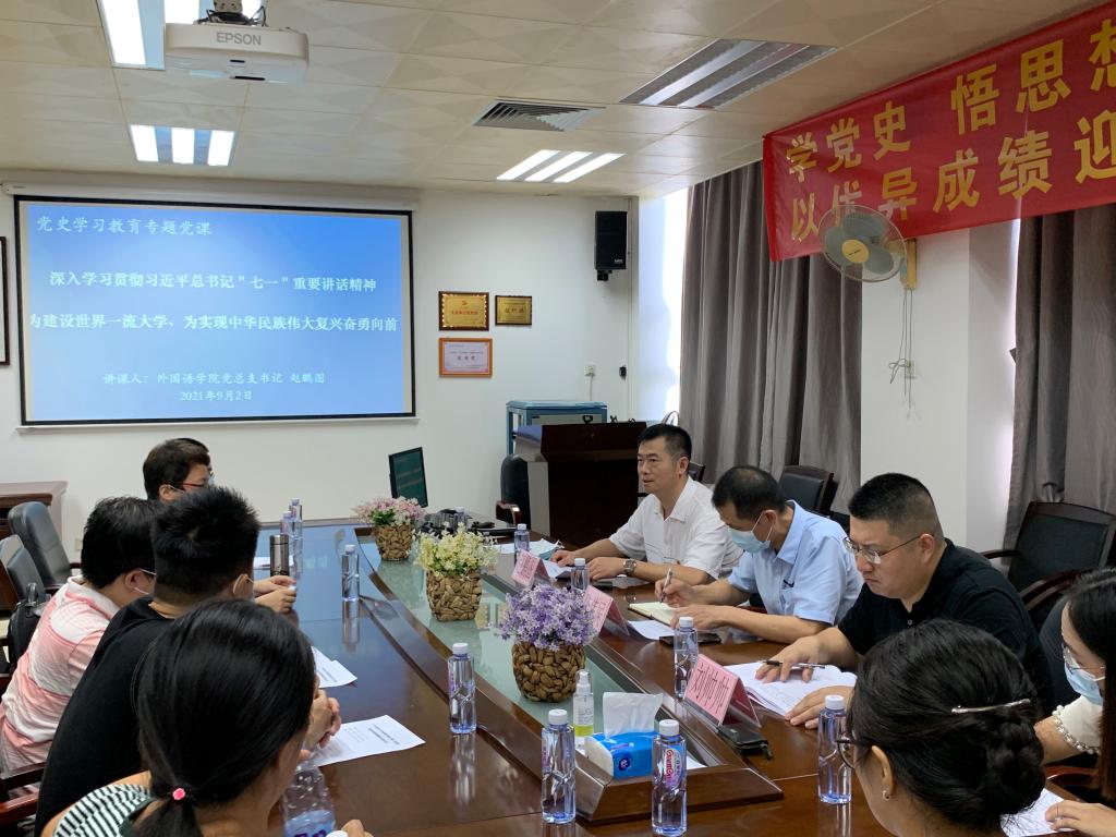 根据学校党史学习教育工作安排,2021年9月2日早9:00到10:00,外国语学院党总支赵鹏图书记为教工第二党支部全体党员老师讲党课,二支部全体党员老师参加,省委教育工委党史学习教育巡回指导第三组副组长陈为民和学校党史学习教育领导小组办公室督导组成员汪蓓蓓列席听课。
