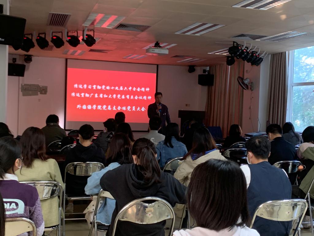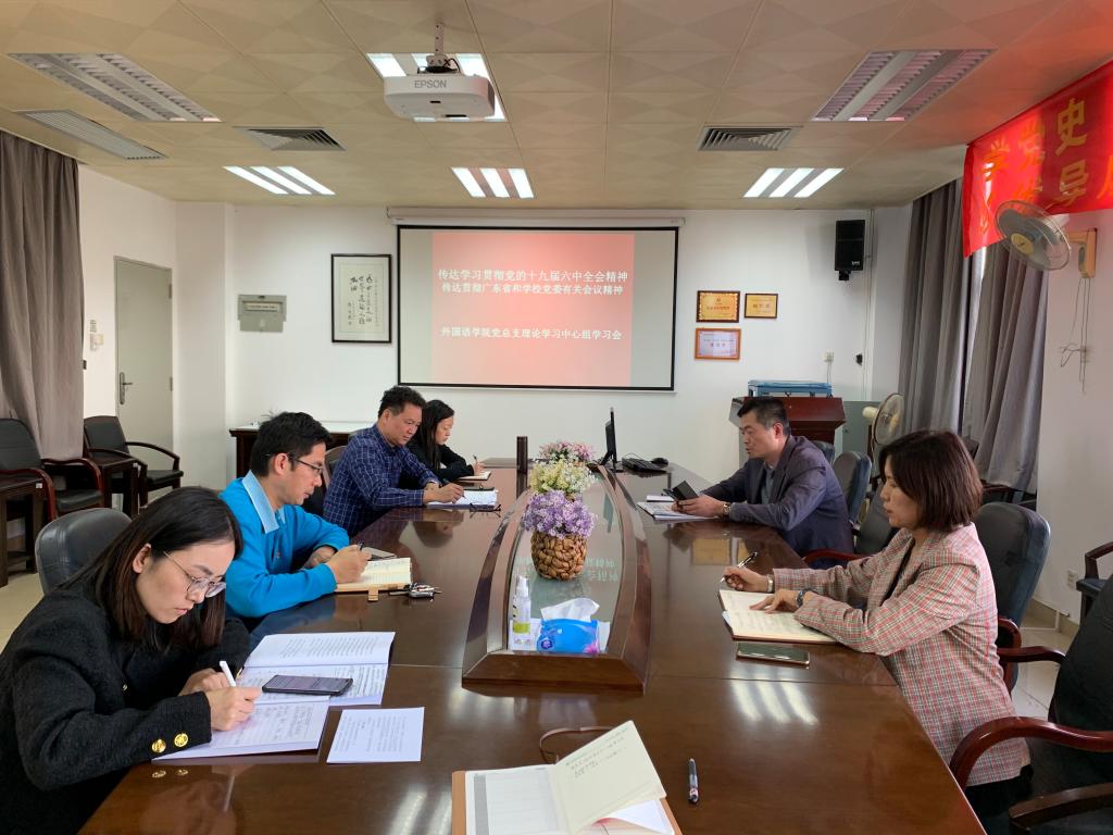 外国语学院党总支分别召开理论学习中心组学习会和党员大会,传达学习贯彻党的十九届六中全会精神,传达贯彻广东省和学校党委有关会议精神。