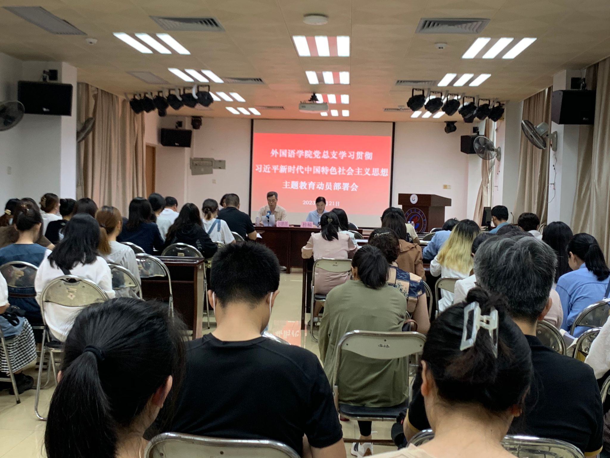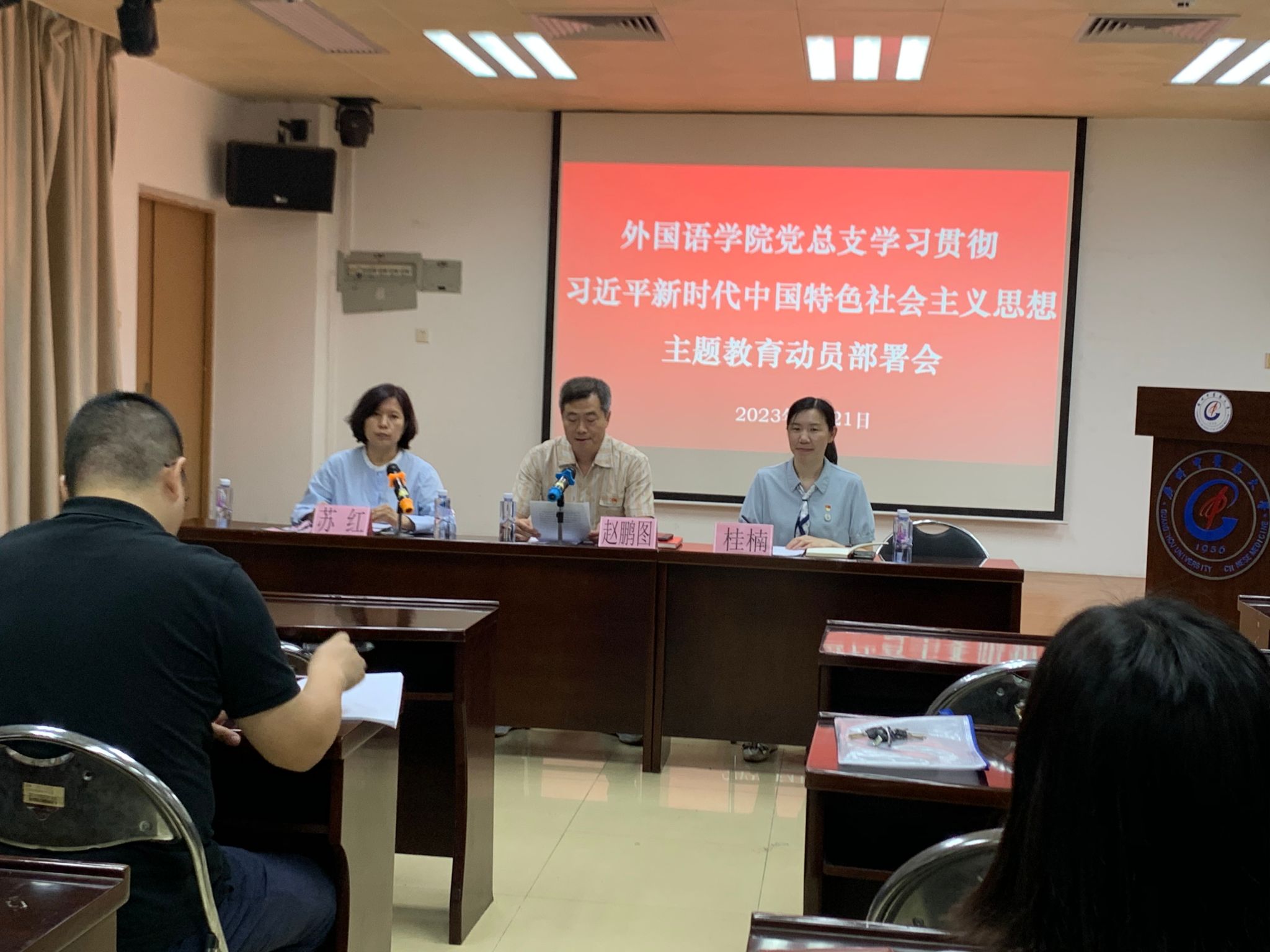 4月21日上午,外国语学院党总支在人文楼201召开学习贯彻习近平新时代中国特色社会主义思想主题教育动员部署会,传达学校主题教育动员部署会的会议精神,对学院开展主题教育进行动员部署。会议由学院党总支副书记、院长苏红主持,学院党总支书记赵鹏图作动员讲话并宣读学院主题教育工作方案。学校主题教育督查工作组成员桂楠列席。