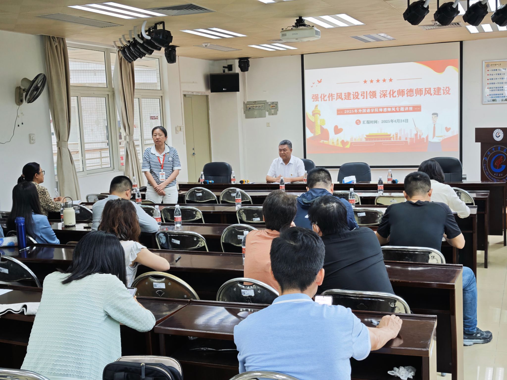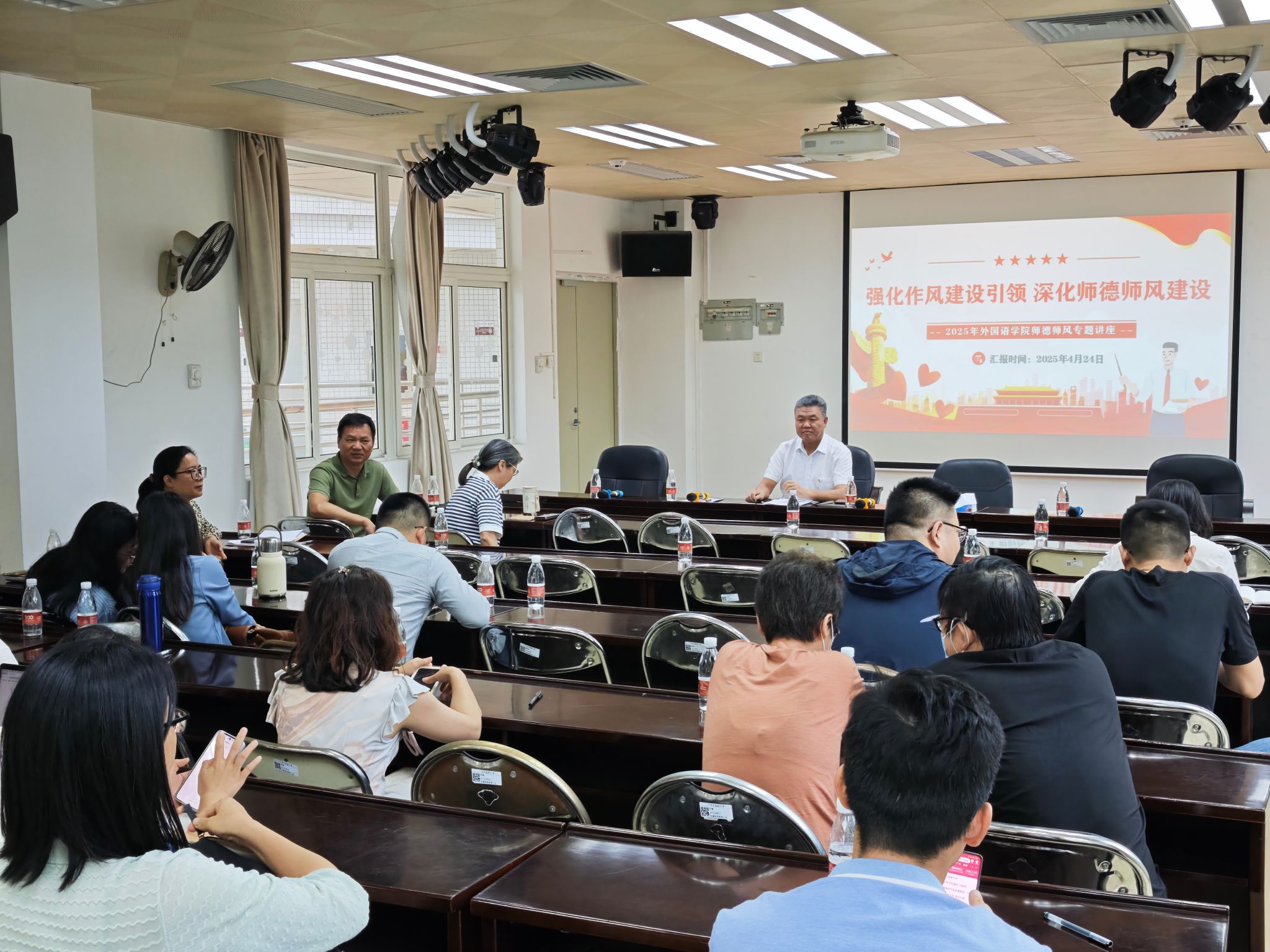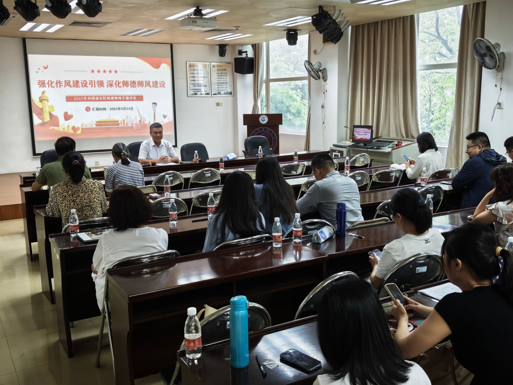 2025年4月24日下午,外国语学院在人文楼201教室围绕“强化作风建设引领,深化师德师风建设”主题开展专题讲座。活动由学院党委书记、院长王宏主持,外国语学院在校教师参与本次讲座。
