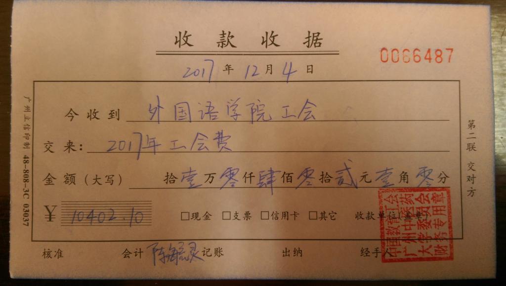 外国语学院工会2017年度上交工会费收据