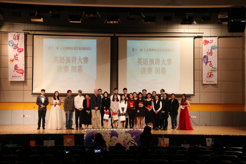 为了进一步弘扬和发展人文精神,提升学生的专业素养,由马克思主义学院和外国语学院联合举办的英语演讲大赛决赛于12月8日晚7点在国际会议厅拉开帷幕。经过海选和初赛,最终有十一位选手进入本次决赛,决赛的评委分别由外国语学院苏红院长、龚隆勤副院长,英专教研室胡敏娜老师、郭旭老师,以及外教Daniel老师和Wayne老师担任。出席本次比赛的嘉宾还有外国语学院程宾副书记,学工办苏淑婉老师、汪蓓蓓老师。