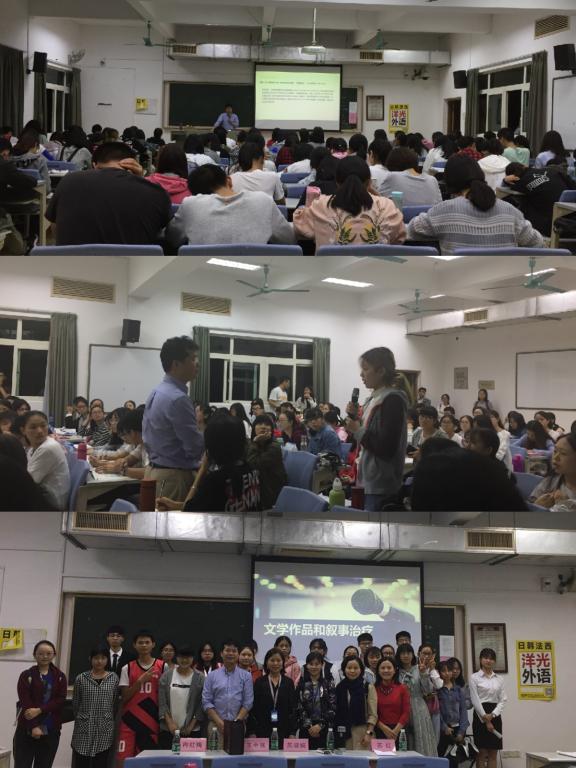 10月17日晚7点,由马克思主义学院和外国语学院共同举办的第十二届人文精神活动月之人文高端大讲堂第二讲“文学作品和叙事治疗”在教学楼A201顺利举行。本场讲座邀请了南方医科大学外国语学院王中强教授担任主讲人,莅临本场讲座的嘉宾有外国语学院苏红院长,教研室周佳媛老师、马海宁老师、甘胜男老师、甄葭老师,以及学工办苏淑婉老师。