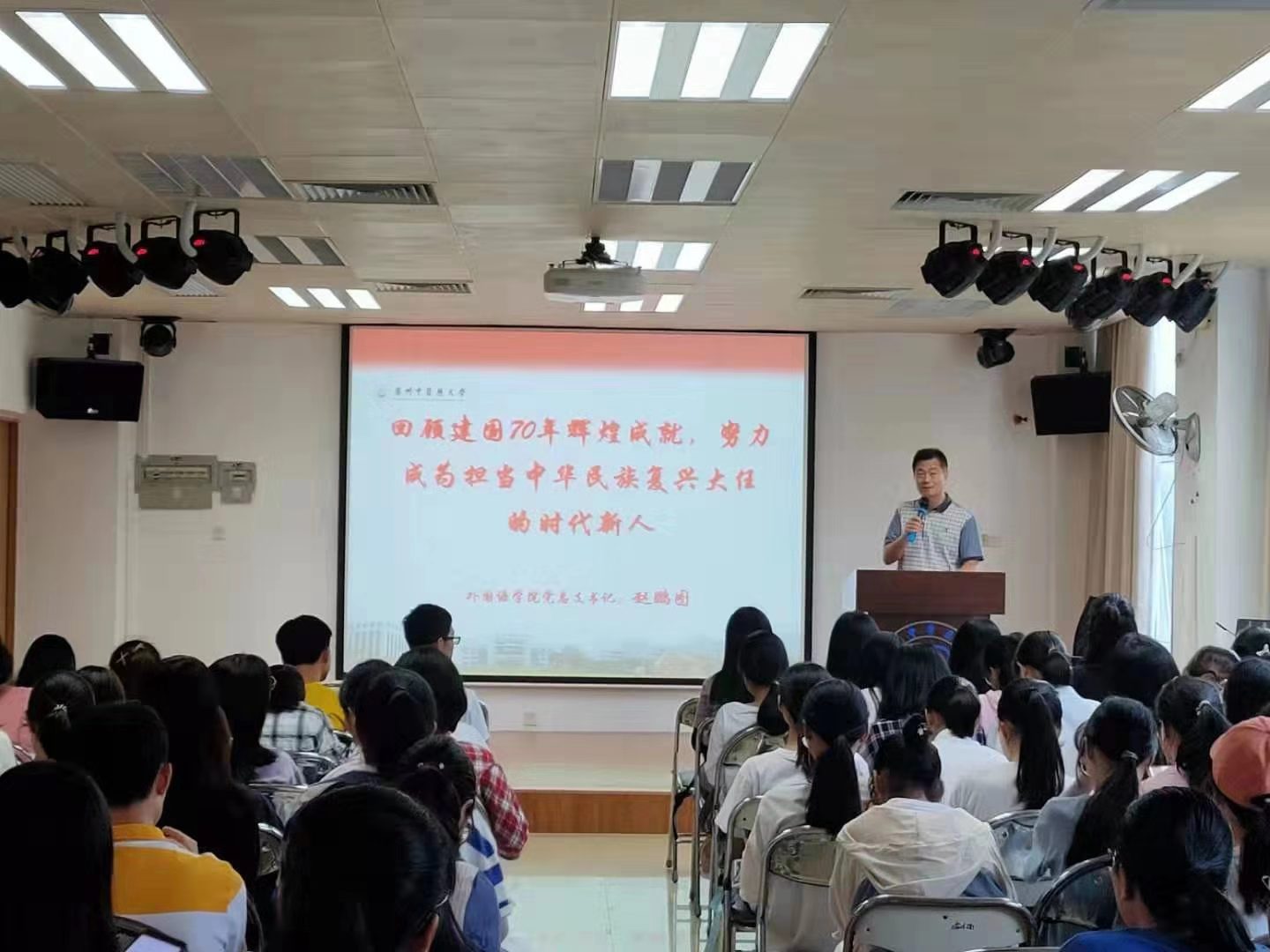 9月29日下午,赵鹏图书记以《回顾建国70年辉煌成就,努力成为担当中华民族复兴大任的时代新人》为题,为学院19级全体学生讲授思政“第一课”。课上,赵书记首先为新生们讲述了我国建国70年以来取得的辉煌成就,向同学们倡导将国家2020年全面建成小康社会、2035年基本实现社会主义现代化、2049年建设成富强民主文明和谐美丽的社会主义现代化强国的伟大战略与自身奋斗紧密结合,成为建设者中的主力军。其后,赵书记重点介绍我校的“双一流”和高水平大学建设,希望大家充分发挥学校特色,形成自身优势,学习专业知识和技能。最后,书记殷切希望大家充分利用好学校众多的学习资源,培养高尚正确的品德和情操,学好专业知识和技能。