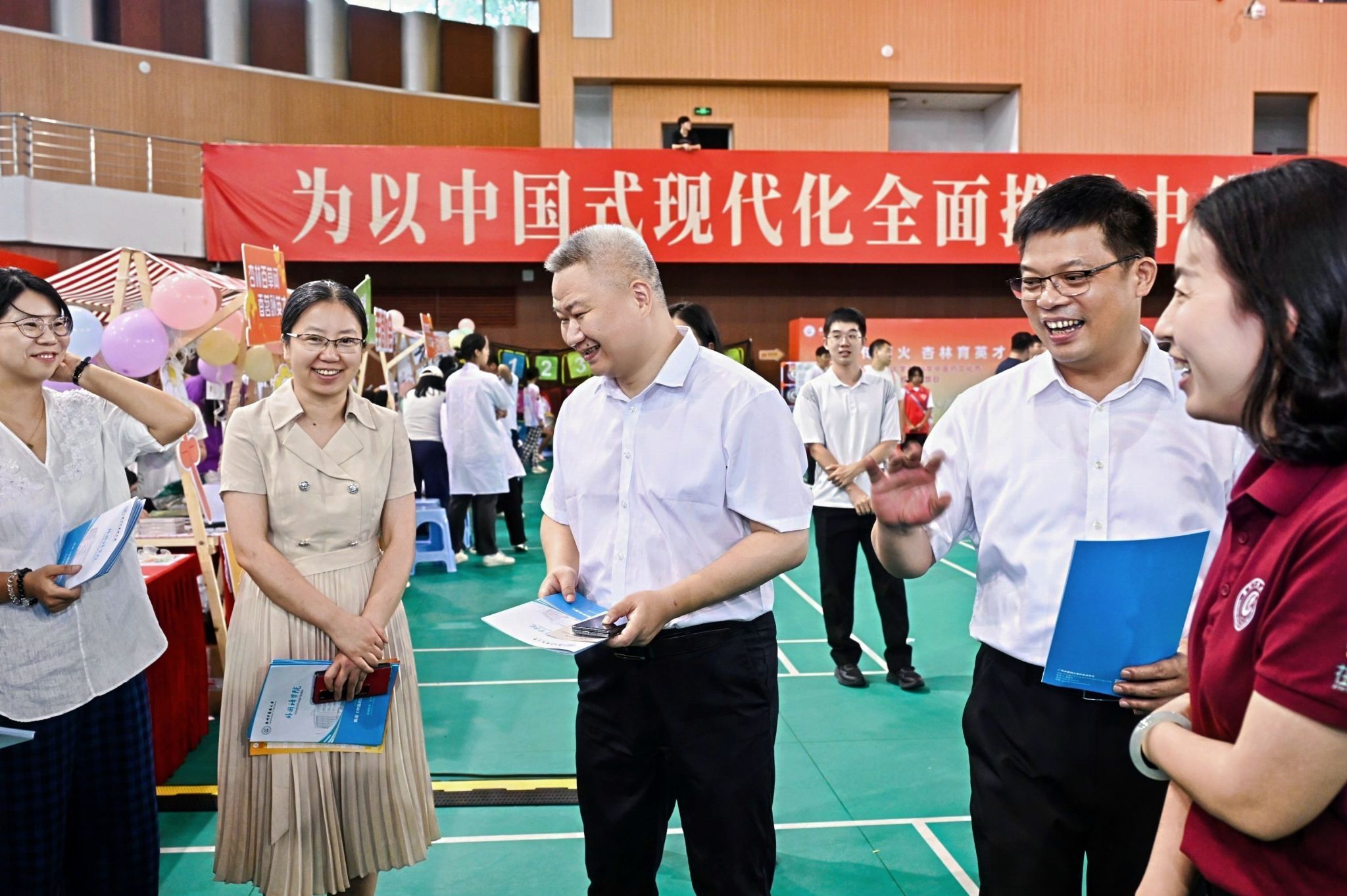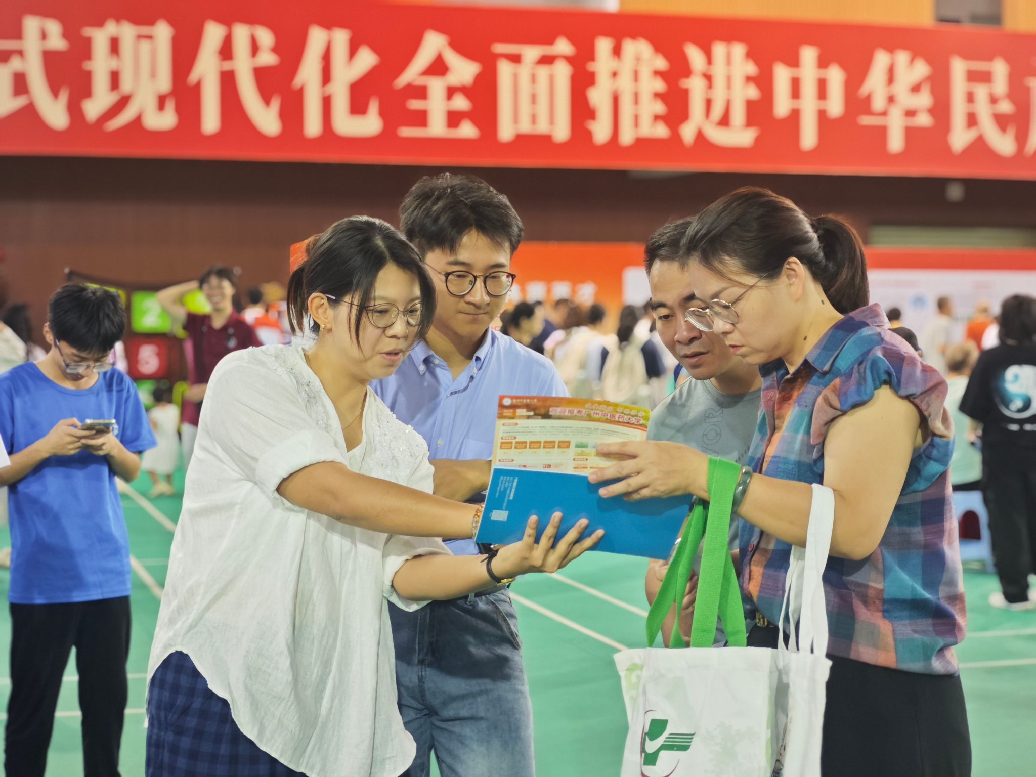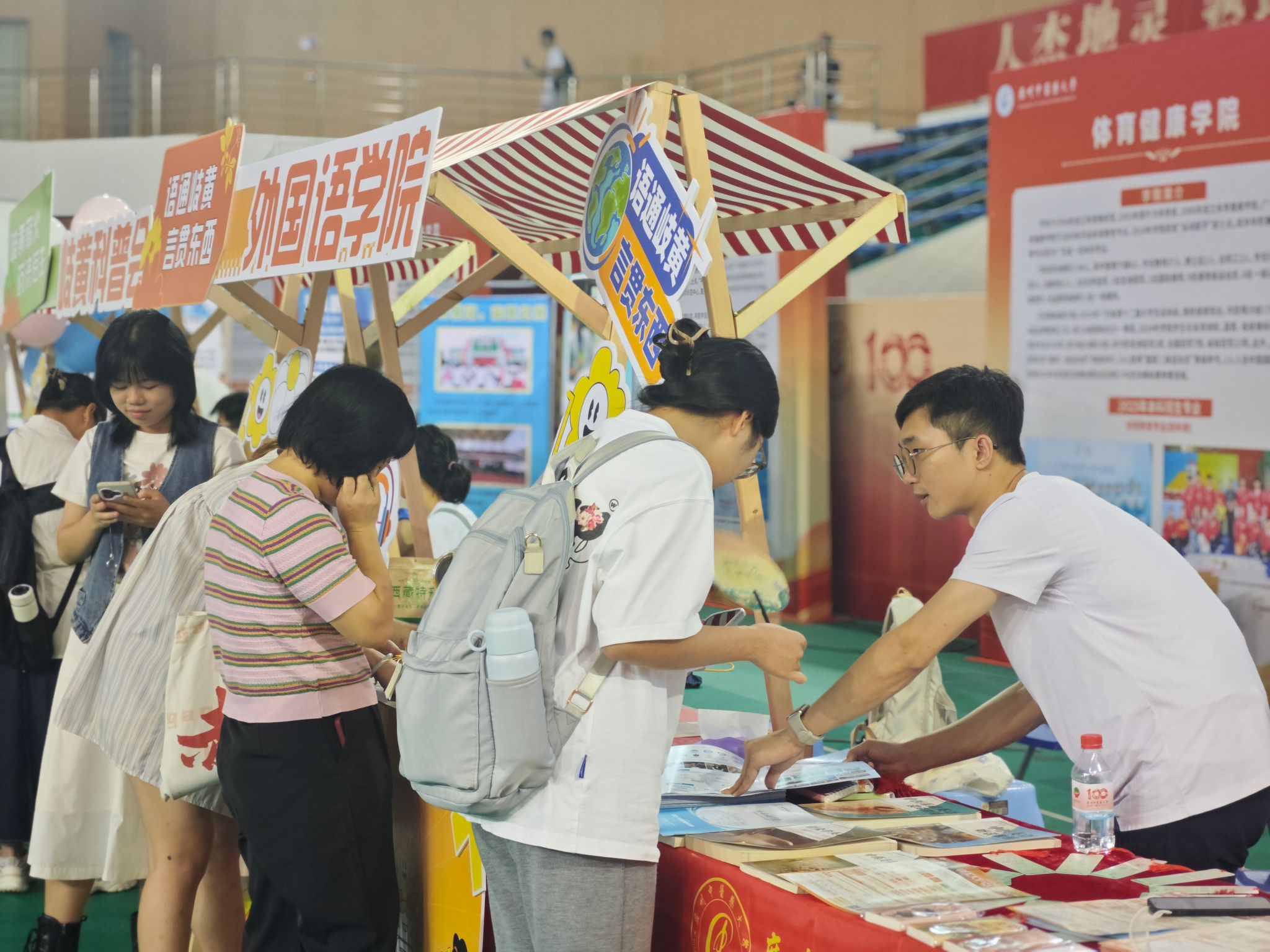 2025年6月21日,外国语学院于大学城校区体育馆参加学校校园开放日活动,面向考生及家长开展招生咨询。学院党委副书记、副院长苗青,副院长陈媛,大学英语2教研室主任陈茜茜,大学英语2教研室专任教师马欢乐,外语技术研究室张晓锋、张升升等教师现场坐镇,为考生深入解读“英语+中医药+国际传播”培养特色,并现场为咨询考生答疑解惑。