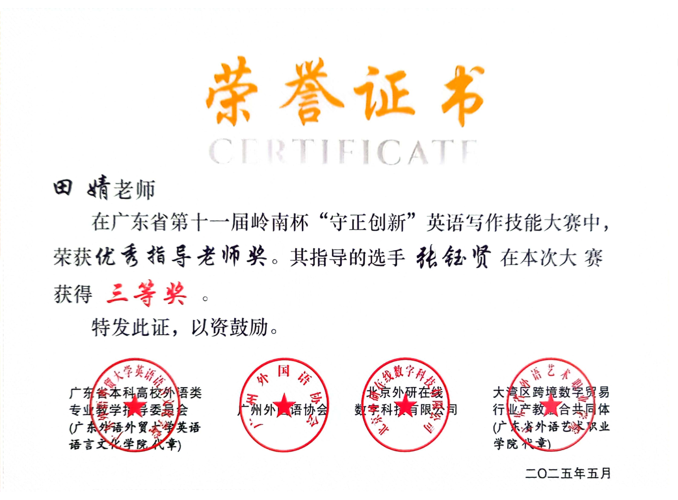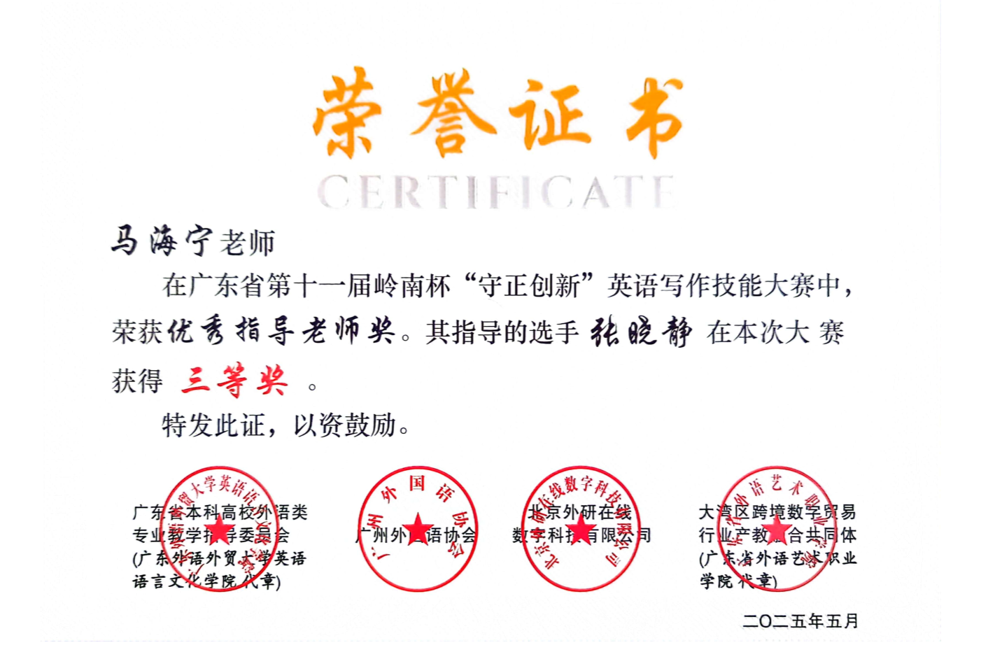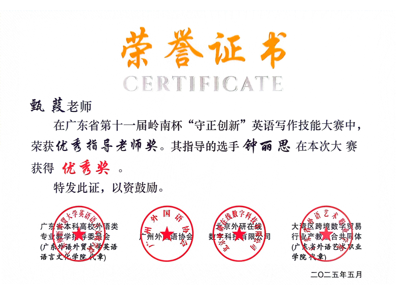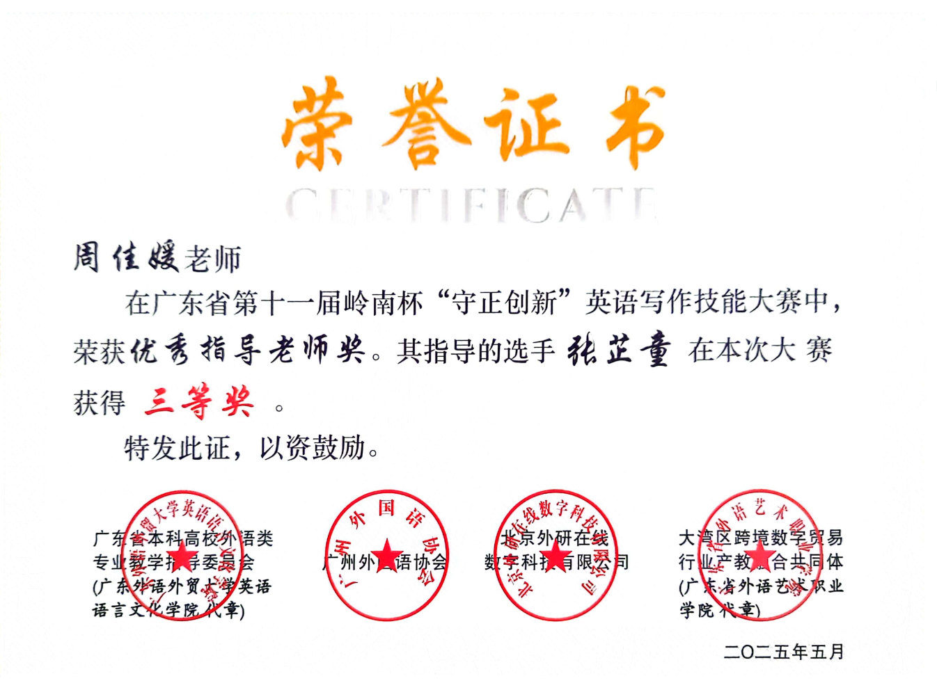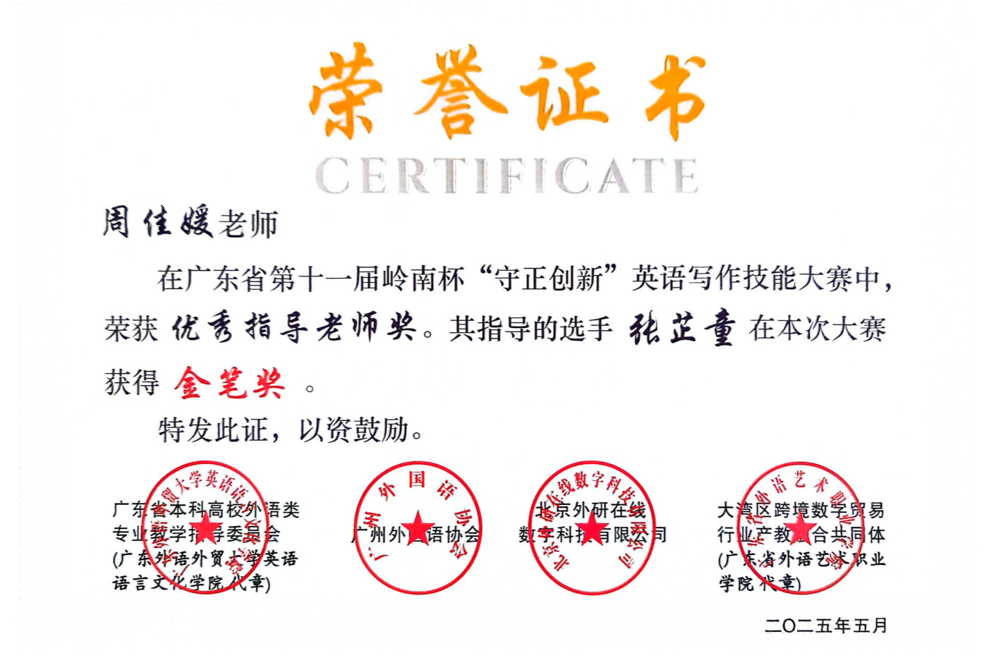 近期,伟德国际1946外国语学院教师指导学生参与省级英语写作竞赛成绩斐然,捷报频传。在两项重要的省级赛事中,我院教师指导学生共获奖11项,其中周佳媛老师指导张芷童同学荣获2025年岭南杯英语写作技能大赛省级金笔奖;苗媛媛老师指导郭怡欣同学荣获2025年广东省第十二届“联盟杯”本科高校写作大赛省级非英语专业组特等奖。详细名单如下所示。