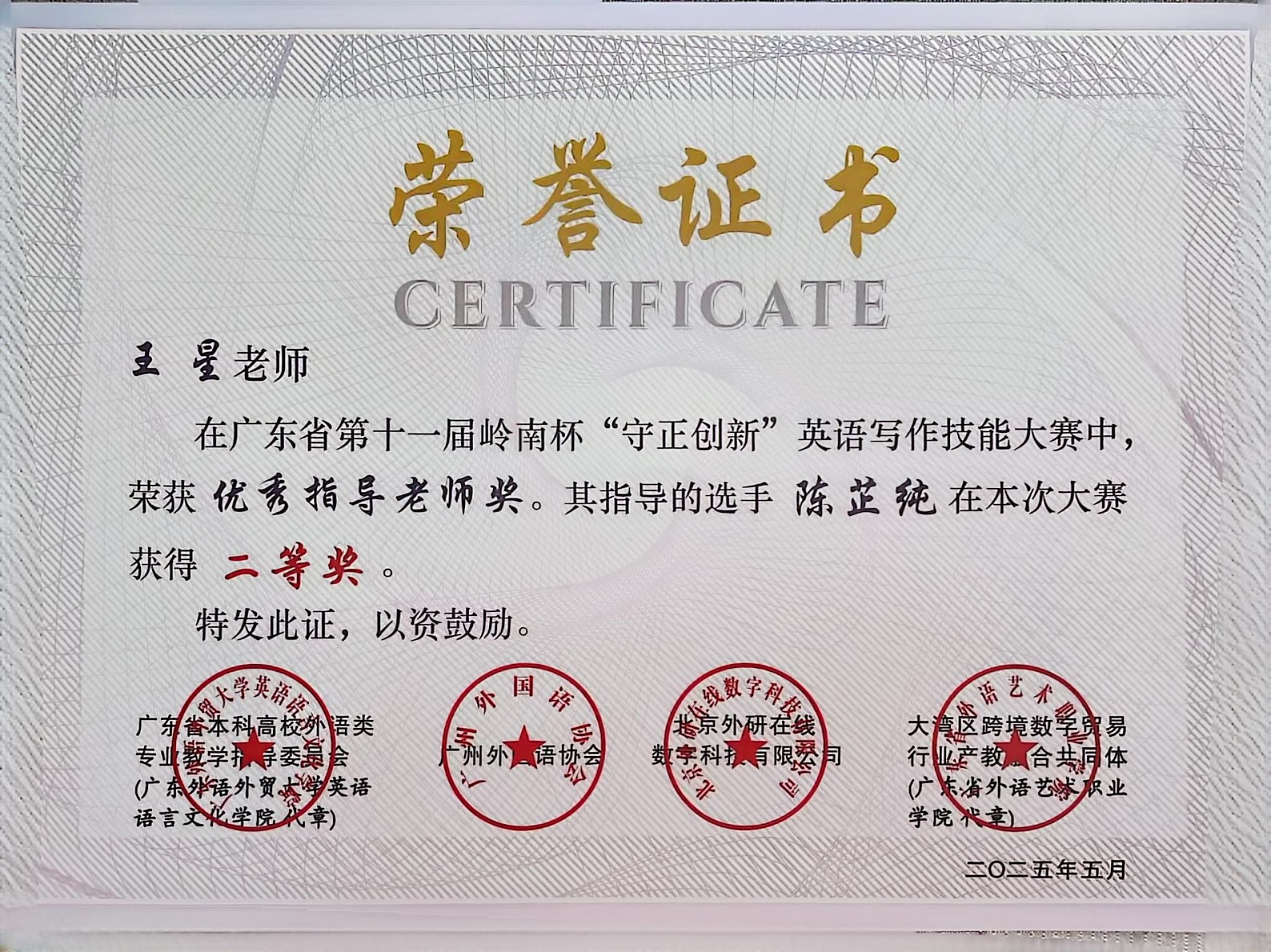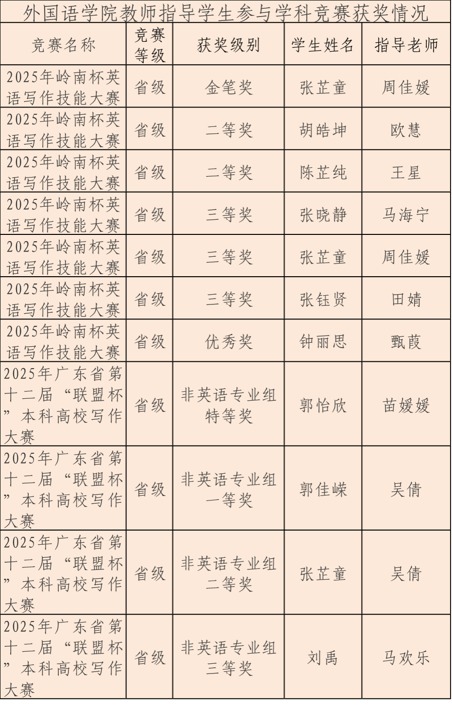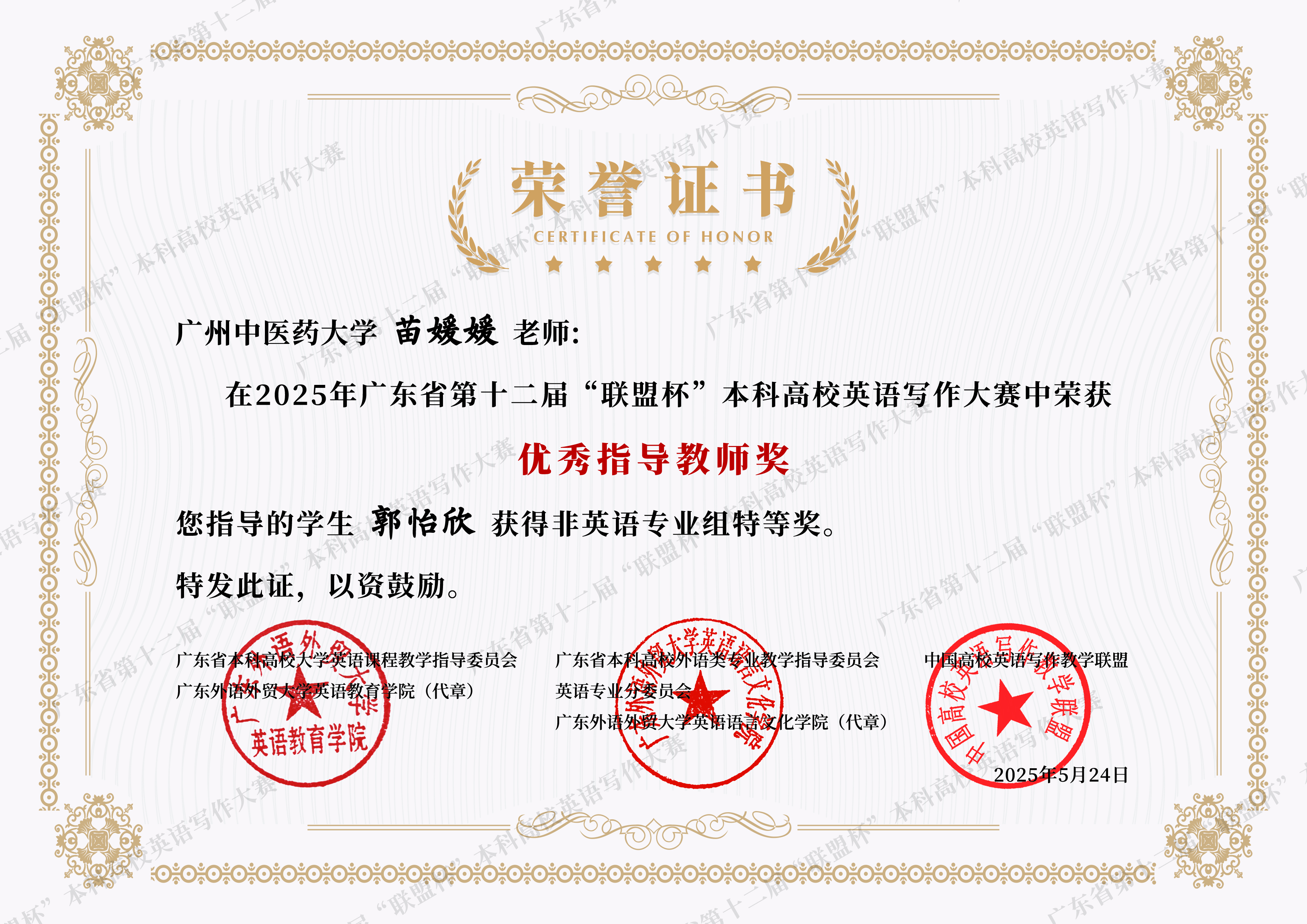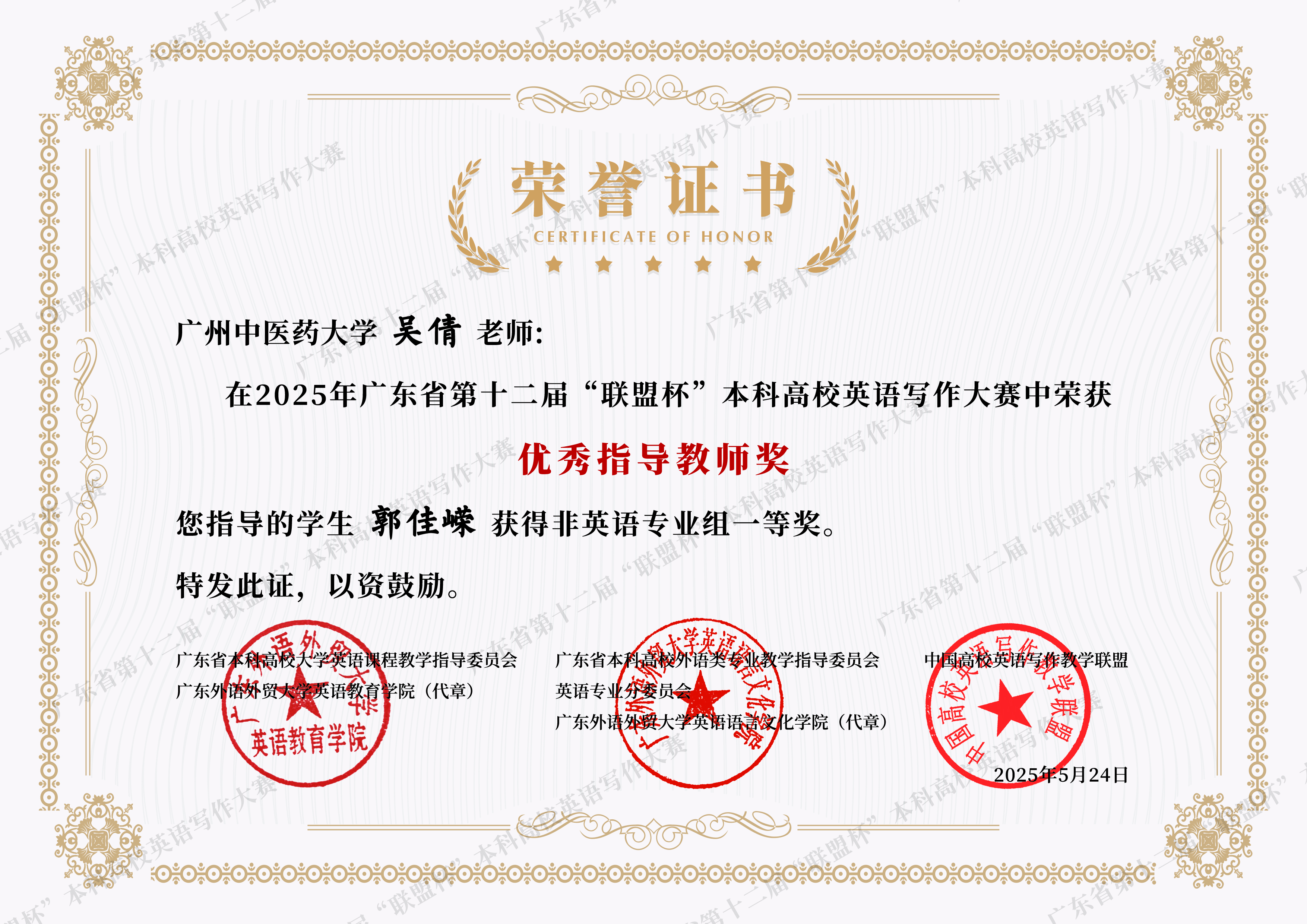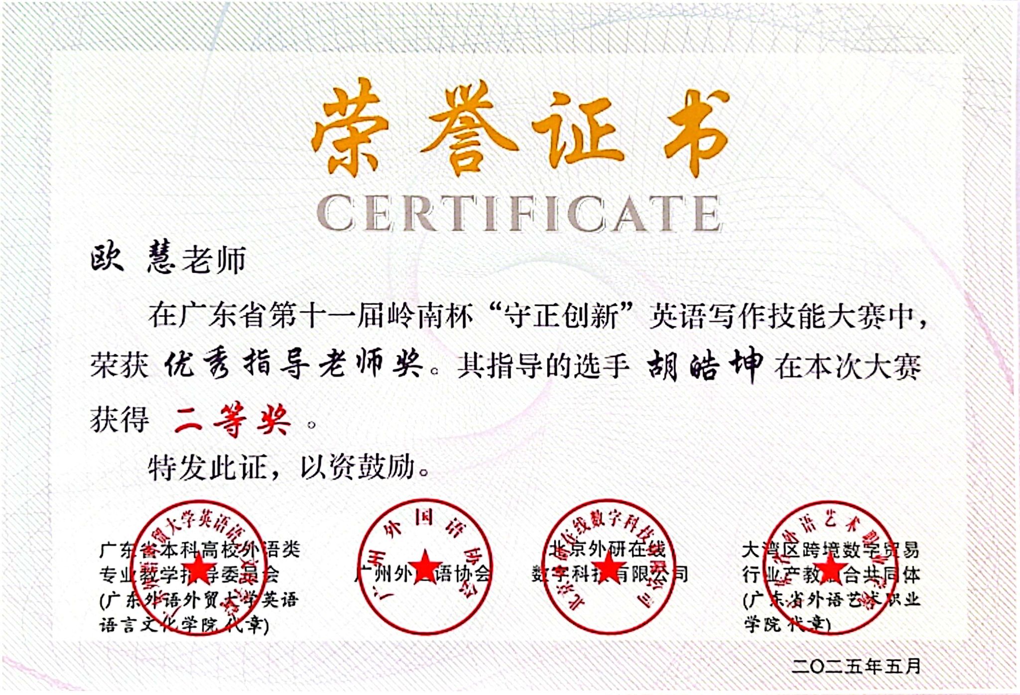 近期,伟德国际1946外国语学院教师指导学生参与省级英语写作竞赛成绩斐然,捷报频传。在两项重要的省级赛事中,我院教师指导学生共获奖11项,其中周佳媛老师指导张芷童同学荣获2025年岭南杯英语写作技能大赛省级金笔奖;苗媛媛老师指导郭怡欣同学荣获2025年广东省第十二届“联盟杯”本科高校写作大赛省级非英语专业组特等奖。详细名单如下所示。