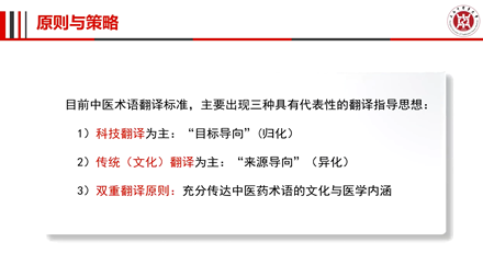 讲座主要围绕中医药英译标准化、中医药术语英译代表性翻译原则以及中医药术语英译焦点问题等核心内容展开。中医药英译标准涵盖国家标准、国际标准以及学者个人编撰的词典等不同的标准。中医药术语英译代表性翻译原则存在科技派与文化派之争,科技派主张使用西医生物医学术语翻译中医术语,文化派主张保留中医原貌,体现中医的传统性。二者折中的双重翻译原则,则主张充分传达中药术语的文化和医学内涵,坚持以我为主,融贯中西。周教授认为,三个翻译原则各有所长,在翻译实践中我们可以根据翻译的目的进行取舍。