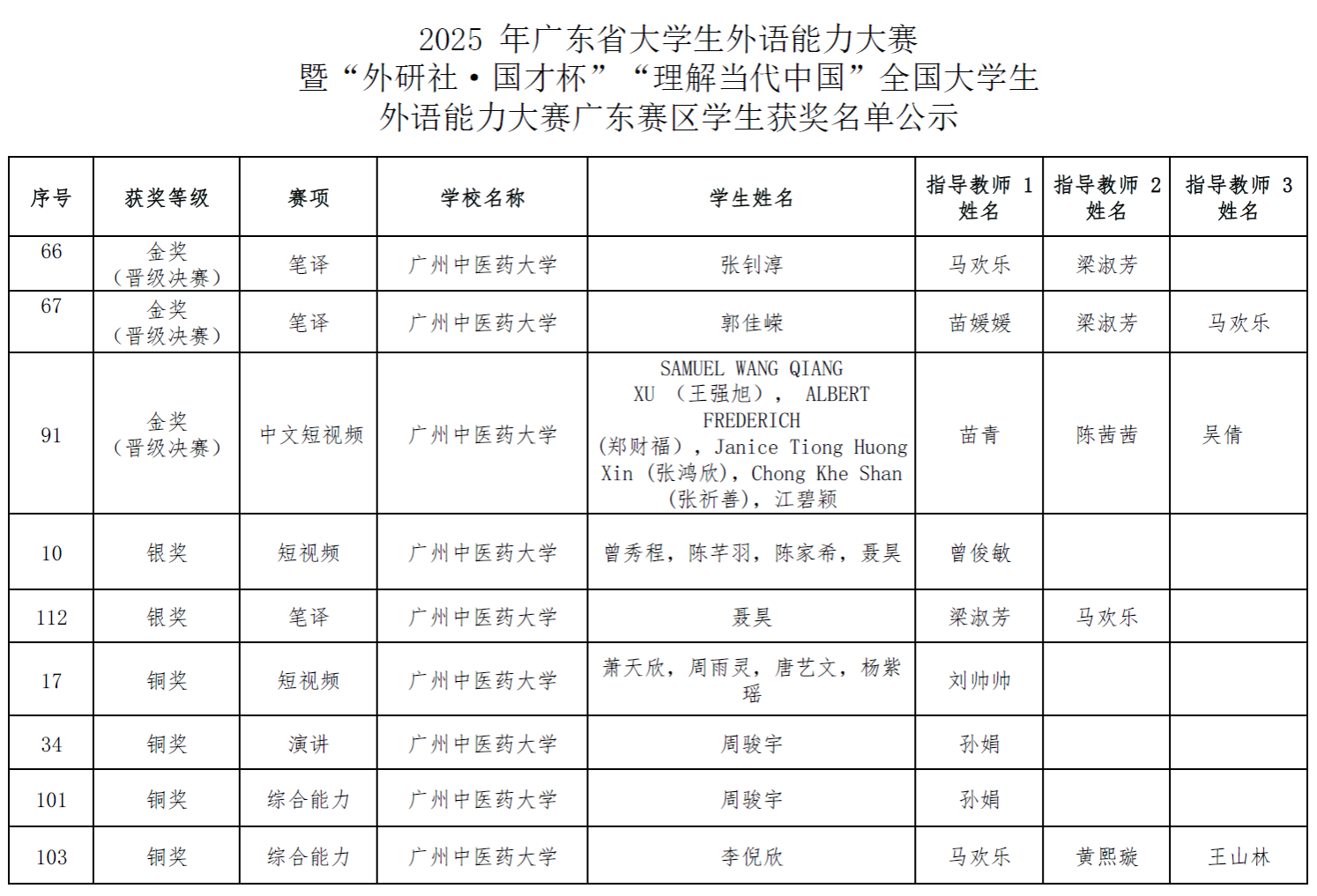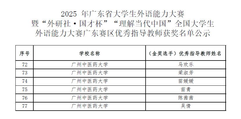 经过校内选拔与精心备赛,我校学子在省赛中展现出扎实的外语功底和出色的跨文化沟通能力,在激烈角逐中脱颖而出,斩获3金、2银、4铜的优异成绩,其中7名同学成功晋级全国决赛。值得一提的是,在中文短视频赛项中,广中医代表队作为广东省唯一代表以全国20强的优异成绩晋级全国总决赛。此外,6名指导老师凭借专业、悉心的指导,荣获“优秀指导教师”称号。详细获奖名单如下: