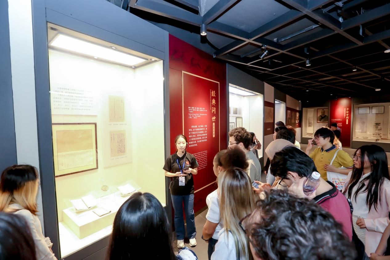 随后,在外国语学院四位英文讲解员的引导下,国际学生参观了广东中医药博物馆的中药液浸植物标本展区(俗称“中药水晶宫”)与医史馆。讲解员用深入浅出的语言,对馆内珍藏的人参标本、中医药始祖像、四大经典医籍、针灸铜人模型以及广彩描金十二生肖图瓷药瓶等展品进行了生动的解说,使国际学生对中国医药学的历史源流与发展脉络有了更为直观和深刻的理解。