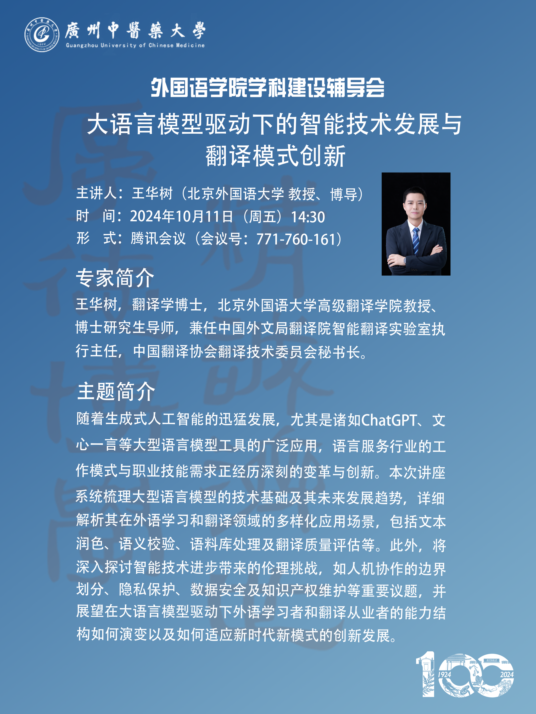 现定于10月11日明天周五下午2:30在腾讯会议召开外国语学院学科建设辅导会,会议邀请北京外国语大学王华树教授为大家作题为:大语言模型驱动下的智能技术发展与翻译模式创新辅导会,欢迎全院教师参会。